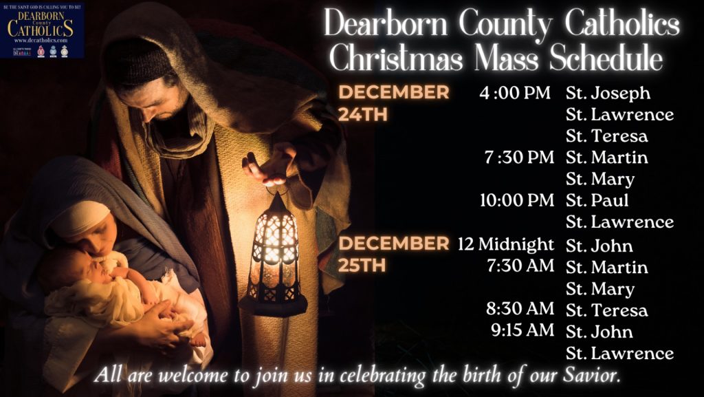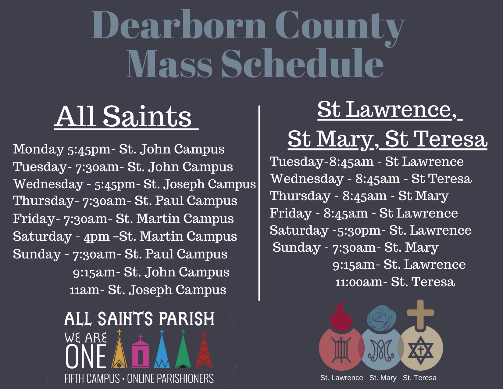 In Dearborn County, Indiana, we are blessed with seven Church buildings, four parishes, two priests, three deacons, highly engaged parishioners and endless possibilities! Please select from the icons above to see what God is doing in our four parishes, and what He is inviting you to enter into.